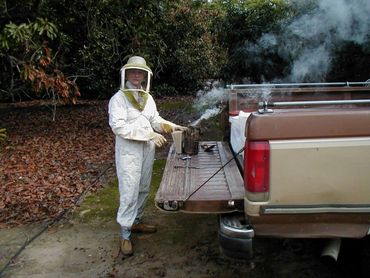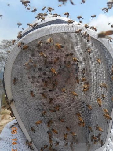 Erika walks with her 'entrouage' of ladies.. when INSIDE the suit the sound of the bees AROUND and ON the veil is electrifying.... aside from the heat inside if on a hot day of bee duty ~